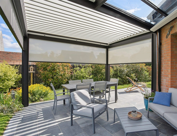 L'ajout de fermetures latérales performantes comme des parois de verre coulissantes et du chauffage d'appoint suffiront pour rendre l'espace agréable. Attention néanmoins à la facture d'éléctricité hivernale, une pergola bioclimatique ne dispose pas de la même isolation qu'une maison.